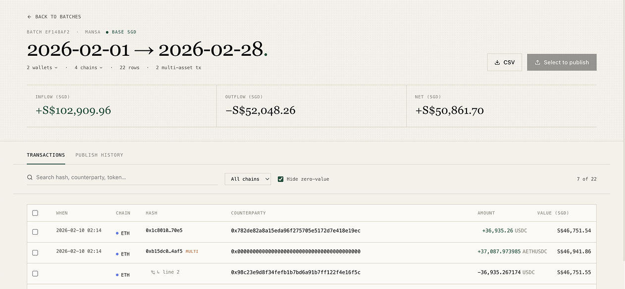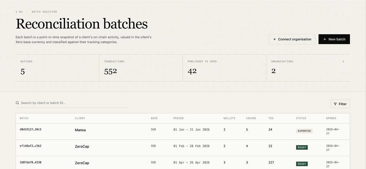 Crypto reconciliation is hard because every wallet address is an unlabeled black box by default. We solved that with on-chain identity correlation: a counterparty resolution model maps each wallet to its real-world identity (centralized exchange, DEX router, custodian, internal wallet, known DeFi protocol) by combining on-chain signals (address labels, transaction patterns, contract interactions) with client-provided context on wallet identity and purpose. AI categorization then suggests Xero account codes per row, internal transfers auto-flag, and the accountant just confirms. Behind the scenes, the pipeline ingests across EVM (6+ networks), Solana, and TRON through a unified provider, splits multi-asset transactions into one row per movement, and converts every figure to the client's base currency using daily central-bank reference rates. Selective publish to Xero with duplicates blocked and a public audit page linked from every entry back to the on-chain proof.