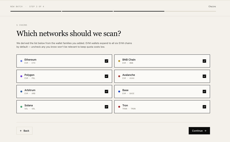 EVM (6+ networks), Solana, TRON, single unified ingest
