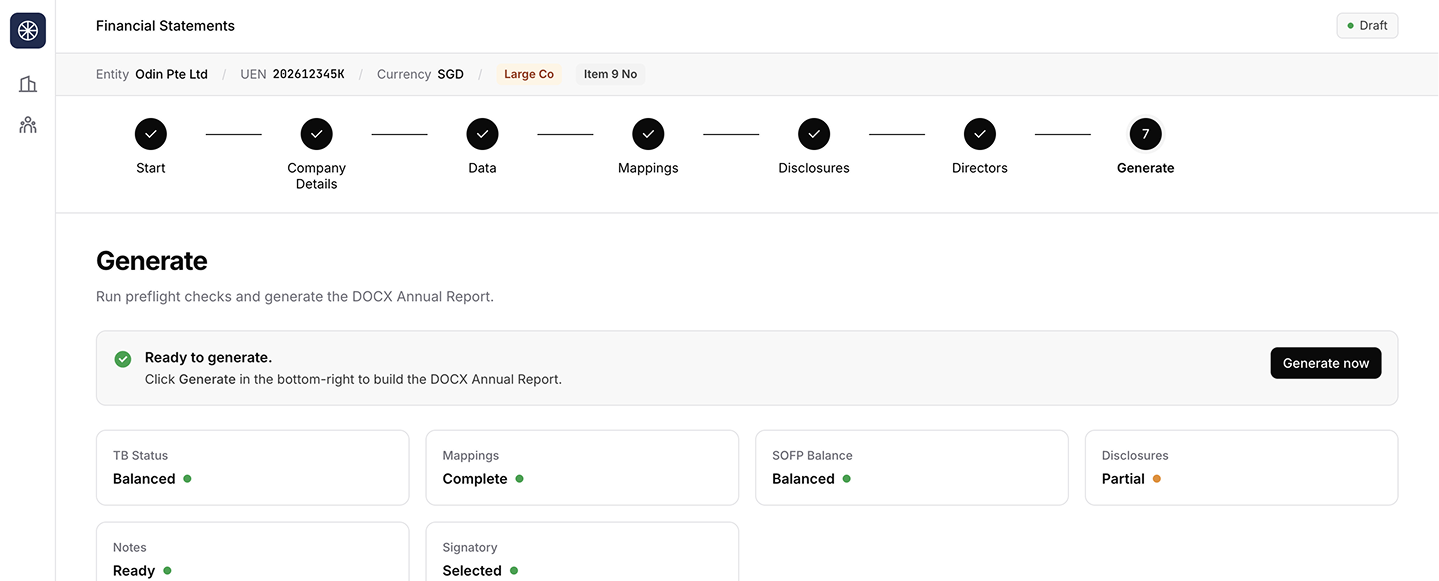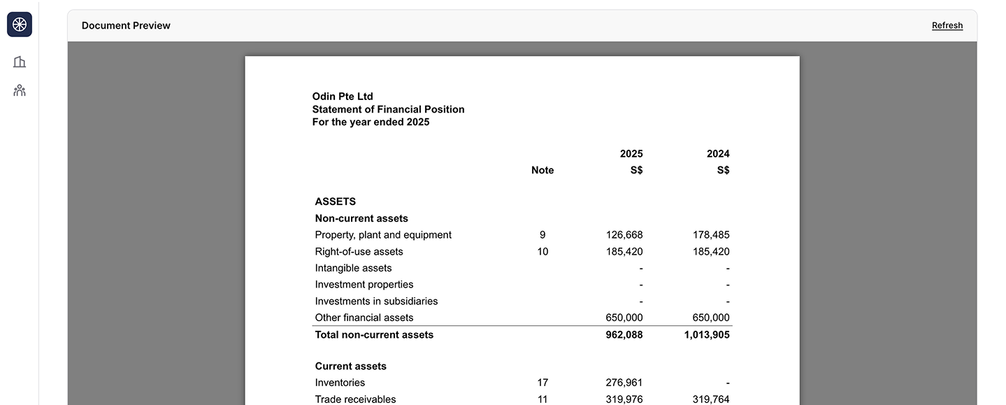 Annual report preparation is one of the most time-expensive workflows in Singapore accounting. Corporate Service Providers spend days per engagement mapping accounts to ACRA taxonomy, drafting SFRS-compliant disclosures, and assembling notes by hand. Existing tools either solve a sliver of the work or carry a Big Four price tag.