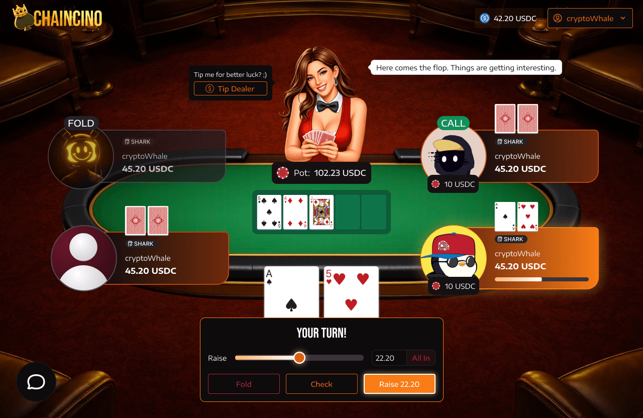 Ape Chain (EVM), Solidity, Cryptographic card dealing, Real-time game engine